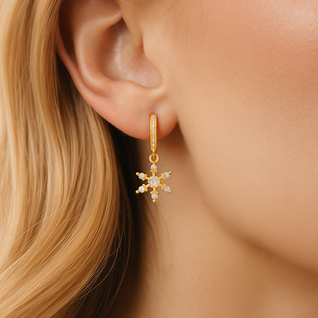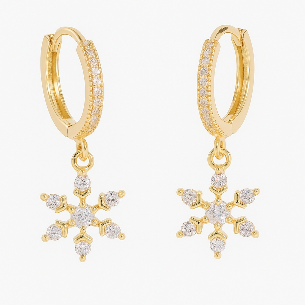 Goudkleurige oorbellen met een sprankelend sneeuwvlok-hangertje. De steentjes geven een subtiele sparkle, waardoor ze perfect zijn voor een frisse, elegante look. Zowel dagelijks als tijdens de feestdagen.